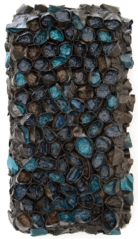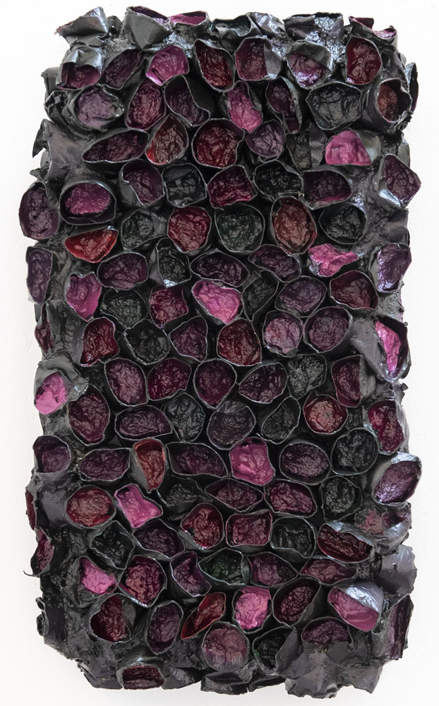 Osnovni nositelj autoričina vizualnog izražavanja jest slaganje recikliranog materijala po neodređenom redoslijedu kojim se dobiva dojam višedimenzionalnog prostora na plohi. Slike kao da namjerno nemaju središte; autorica stvara više fokalnih točaka koje generiraju stapajuću strukturu i time čini živu dišuću organičnu cjelinu. Pogled promatrača ne skače s jedne na drugu točku, nego fluidno teče kroz sliku, rezultirajući neobjašnjivom privlačnom i hipnotičkom silom. Granice drvenog panela, napučenima precizno posloženim kružnim elementima, kao da nisu dovoljne, pa oni počinju pupati i rasti jedan preko drugoga, uvodeći tako i karakter skulpturalnosti u slike (Deep Sea, Mountain river, no.2). Dinamičnost površine je naglašena u izmjenjivanju visina kružnih formi, korištenjem tankih i debelih nanosa boje, i naposljetku osvjetljenjem i sjenama koje nastaju na oblim bridovima cikličkih struktura, i u njihovim dubinama.